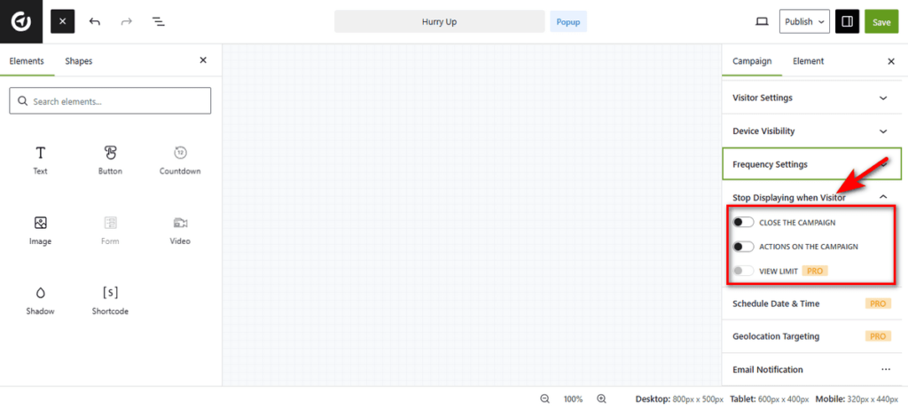 Open a campaign in the Canvas Builder. Click the Stop Displaying when Visitor tab in the right sidebar to expand the controls.