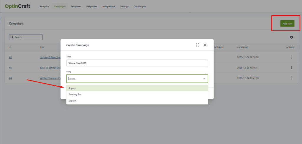 - Choose your campaign type (Popup, Floating Bar, Slide-in, etc.).