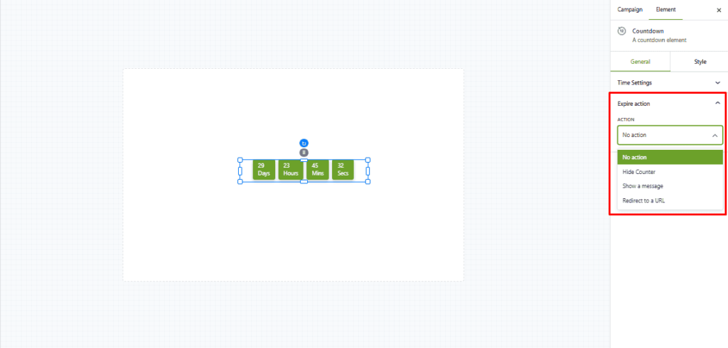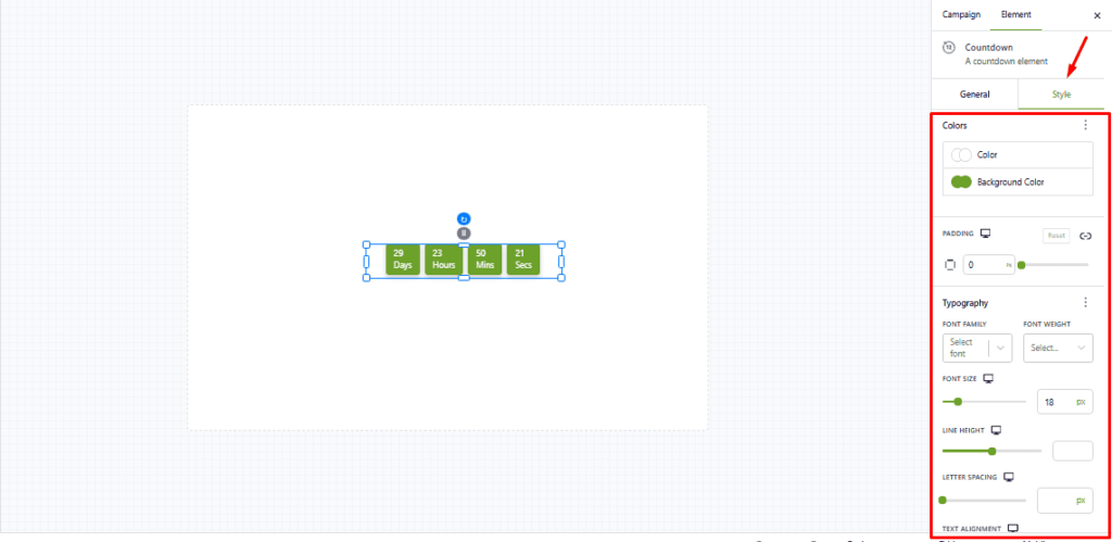 After selecting the Countdown Element, adjust its settings: