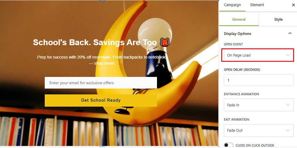 Then, under the ‘Open Event’ dropdown, select the ‘On Page Load‘ option.