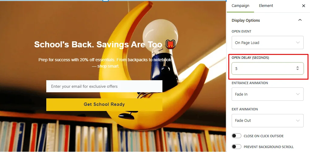 Finally, you can see “OPEN DELAY (SECONDS).” option. Here, you can set the delay in seconds before the popup appears after a visitor enters the page. Simply enter a numeric value to define this duration.