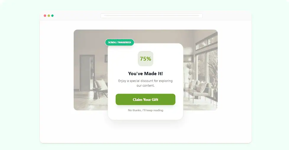 Scroll-triggered popups appear after a user scrolls a certain percentage down the page, such as 40%, 60%, or 80%. This behavior shows active engagement because scrolling indicates that the user is reading or exploring the content.